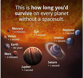 인간은 태양계의 행성에서 맨몸으로 얼마나 오래 살아남을 수 있을까? 인간은 태양계의 행성에서 맨몸으로 얼마나 오래 살아남을 수 있을까?This is how long you'd survive on every planet without a spacesuit. 지구를 벗어나 우주를 여행하거나 다른 행성에 정착하여 생활하는 것을 꿈꾸거나 생각해 보신적이 있으신지요?화성에서 홀로 남아 생존하여 살아가는 모습과 과정을 그린 마션(Martian)이라는 영화도 있고, 전세계의 식량 부족과 경제 붕괴로 인해 인간들이 살 수 있는 새로운 행성을 찾기 위해 떠나는 인터스텔라라는 영화도 아실런지 모르겠습니다. 이 영화들뿐만 아니라, 모든 인간들이 우주로 떠나는 영화들의 공통점은. 우주 공간에서, 또는 다른 행성에서 인간들이 우주복을 착용하고 있다는 점인데요. 이 우주복은 지구와 다른 우주 환.. 더보기 이전 1 ··· 26 27 28 29 30 31 32 ··· 303 다음