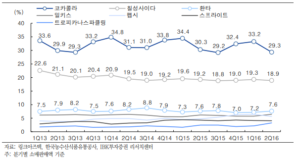 제품별 판매량은 코카콜라(오리지널) 29.3%, 칠성 사이다 18.9%, 환타 7.6% 를 기록하며, 이 1~3위 세개의 음료가 전체 탄산음료 판매량의 55.8%를 차지하고 있습니다.